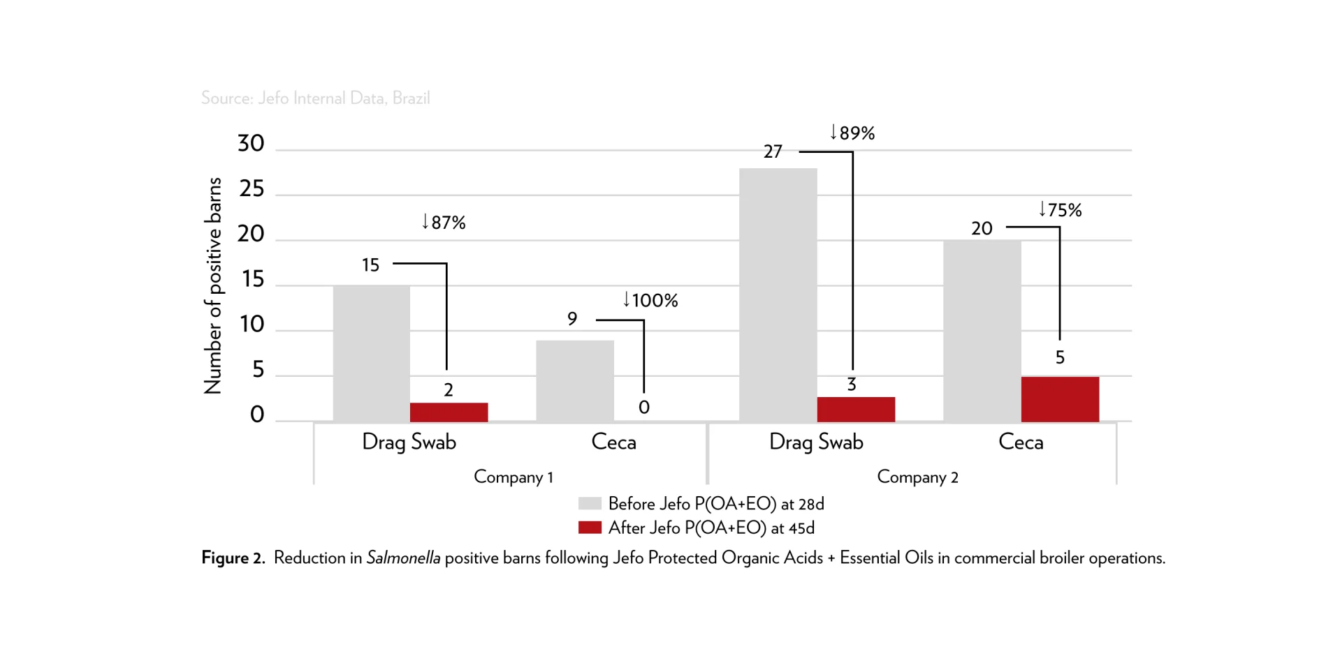 - Jefo Protected Organic Acids + Essential Oils consistently reduce Salmonella levels across strains and improve downstream outcomes.
