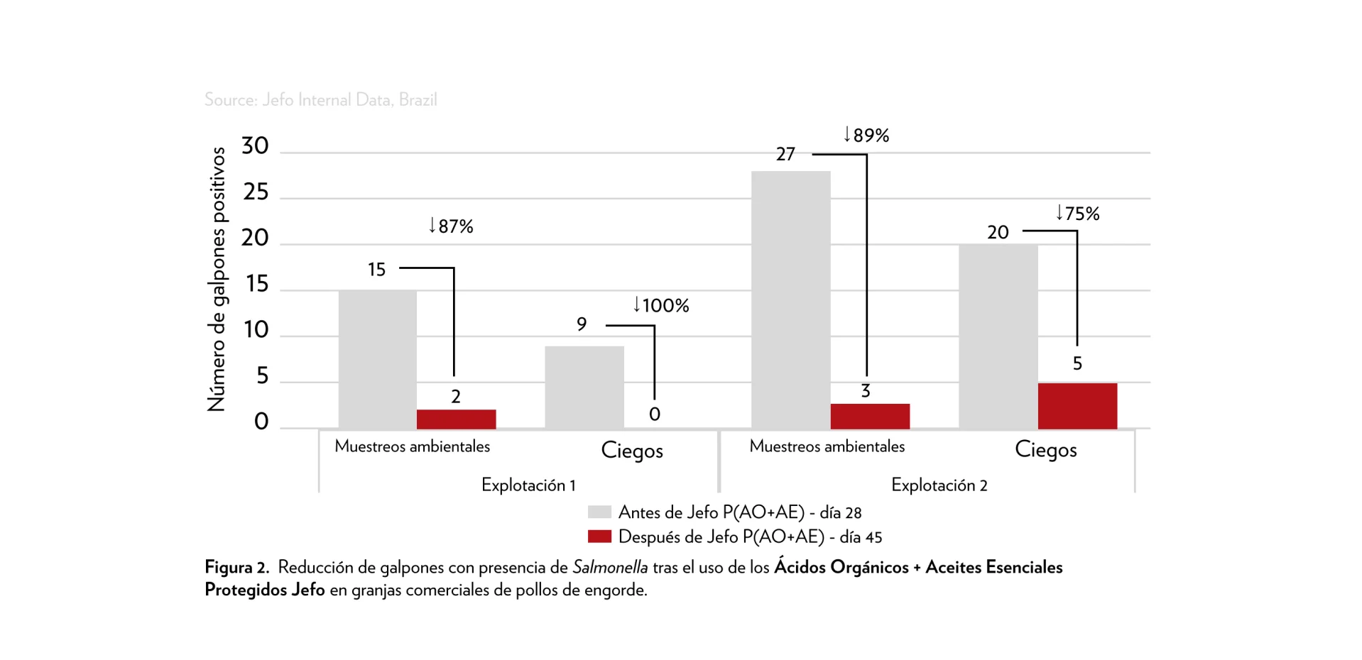 - Los Ácidos Orgánicos + Aceites Esenciales Protegidos Jefo reducen eficazmente los niveles de Salmonella en diversas cepas y contribuyen a mejores resultados a lo largo de toda cadena productiva.