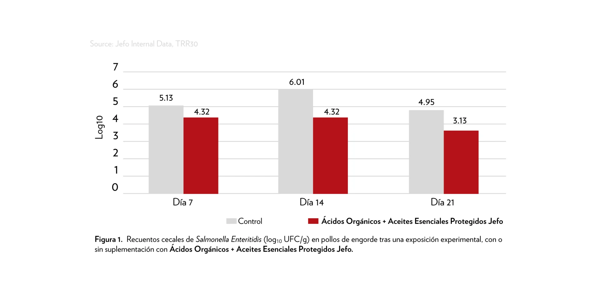 Estudios de investigación han demostrado reducciones consistentes en los recuentos de Salmonella en pollos de engorde suplementados con Ácidos Orgánicos + Aceites Esenciales Protegidos Jefo. Ensayos controlados con exposición a la Salmonella mostraron menores cargas cecales de Salmonella Enteritidis, Salmonella Heidelberg y Salmonella Typhimurium en comparación con aves no suplementadas. Esta consistencia entre las diferentes cepas respalda la solidez y fiabilidad del enfoque.