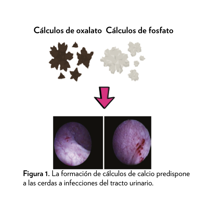 Entre los factores predisponentes a las infecciones urinarias se incluyen la mala higiene, una ingesta insuficiente de agua, períodos prolongados acostadas y la formación de cálculos de calcio en el tracto urinario. Estos cálculos irritan la mucosa de la vejiga y favorecen la proliferación bacteriana (Figura 1). Las cerdas más viejas y las cerdas en lactación son especialmente susceptibles debido a sus características fisiológicas y de comportamiento, como la disminución de la frecuencia de micción durante la lactación. Las infecciones del sistema reproductor suelen originarse por contaminación bacteriana durante el parto, el estro o la monta, cuando la vulva queda expuesta. Esta contaminación se agrava por el contacto con materia fecal, lo que resalta la importancia de un manejo sanitario adecuado.