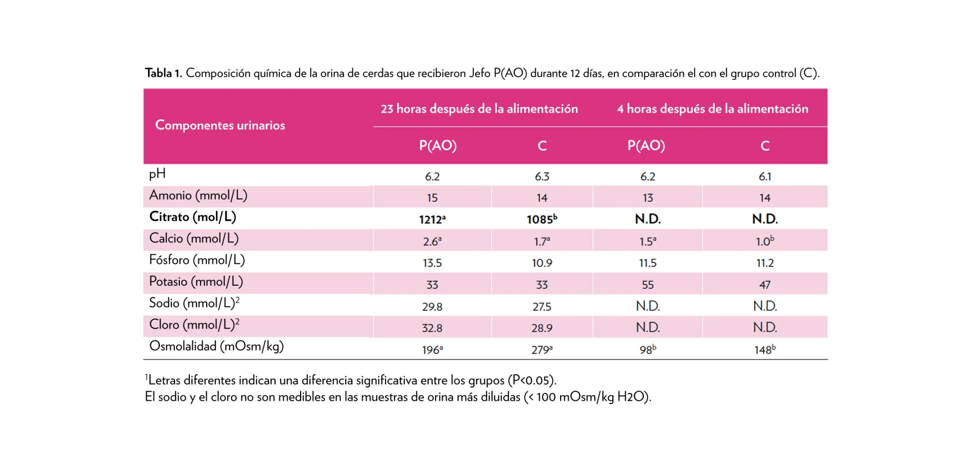 Jefo P(AO) es especialmente eficaz en la prevención de infecciones del tracto urinario al aumentar las concentraciones de citrato en la orina. El citrato actúa como un potente inhibidor de la formación de cálculos de calcio, ya que se une a los iones de calcio e impide su interacción con el oxalato o el fosfato. Esto reduce la formación de cálculos y facilita la eliminación bacteriana gracias a un mayor flujo urinario. La Tabla 1 muestra el aumento significativo de los niveles de citrato y calcio urinarios en cerdas alimentadas con Jefo P(AO), lo que demuestra su eficacia. Además, Jefo P(AO) minimizó la proliferación bacteriana en el tracto urinario de las cerdas tratadas.