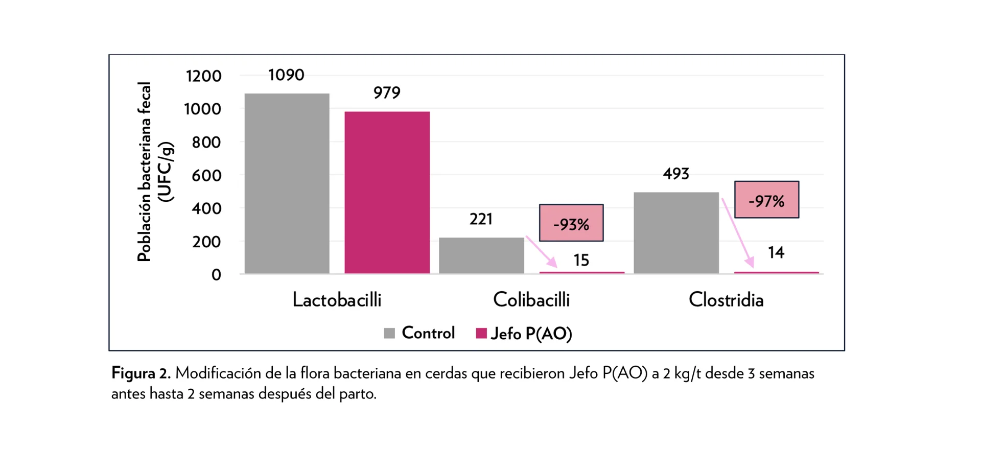 Jefo P(AO) reduce las infecciones del sistema reproductor al disminuir la excreción de patógenos en el estiércol y limitar la contaminación ambiental (Figura 2). Al mantener una microbiota intestinal saludable, también contribuye de manera indirecta a un entorno reproductivo más sano, reduciendo el riesgo de colonización bacteriana en el tracto genital. Este enfoque no solo mejora la salud de las cerdas, sino que también incrementa la supervivencia y el rendimiento de los lechones.