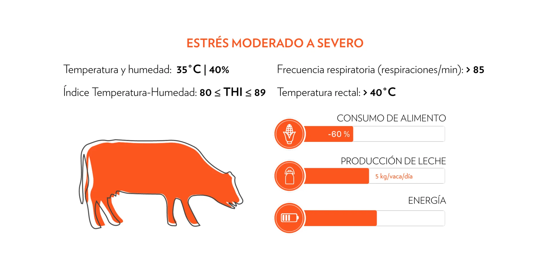 El índice temperatura‑humedad (THI – figura 1) se utiliza para evaluar la intensidad del estrés térmico en las vacas. Cuando el THI es elevado, los animales tienen dificultades para disipar el calor de forma eficiente. El aumento de la temperatura corporal central reduce la ingestión de alimento, lo que se traduce en una menor producción de componentes lácteos y en un deterioro del rendimiento reproductivo. El primer paso consiste en gestionar el rebaño y las instalaciones para minimizar el impacto negativo de un THI moderado a alto.