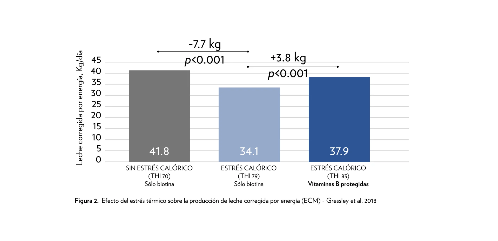 Investigaciones recientes han confirmado una mejora en los componentes de la leche cuando se suministran vitaminas B protegidas del rumen a vacas lecheras sometidas a estrés térmico. Vacas bajo estrés térmico (THI = 83) que recibieron una mezcla exclusiva de vitaminas B protegidas para vacas en lactación produjeron 3,8 kg más de leche corregida por energía, ajustada a 150 días en leche. Esta respuesta significativa se ha repetido en otros ensayos realizados en Ontario, California y México.