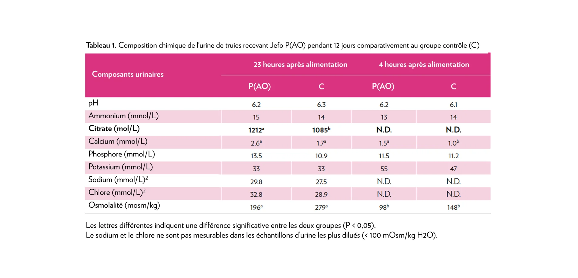 Jefo P(AO) est particulièrement efficace pour prévenir les infections urinaires en augmentant la concentration de citrate urinaire. Le citrate agit comme un puissant inhibiteur de la formation de calculs calciques : il se lie aux ions de calcium et empêche leur interaction avec l’oxalate ou le phosphate. Cela réduit la formation de calculs et facilite l’élimination bactérienne grâce à une augmentation du flux urinaire. Le Tableau 1 montre l’augmentation significative du citrate urinaire et des niveaux de calcium chez les truies supplémentées avec Jefo P(AO), démontrant son efficacité. De plus, Jefo P(AO) a limité la prolifération bactérienne dans les voies urinaires des truies traitées.