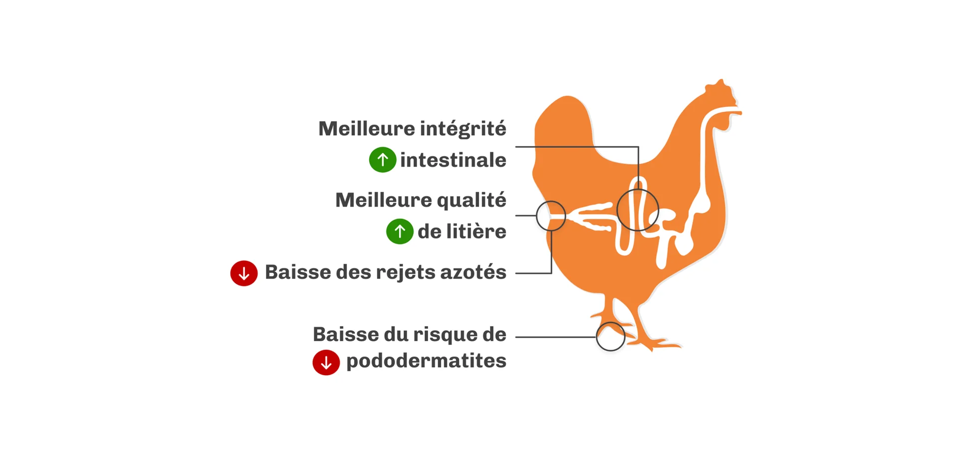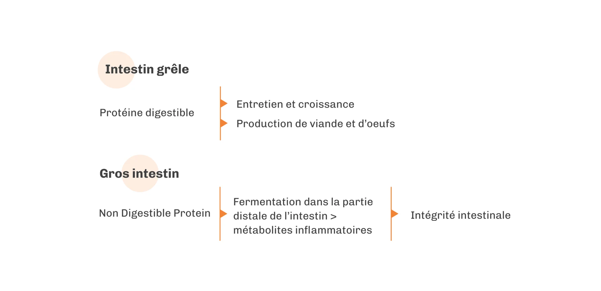 Pour gérer efficacement le flux de protéines alimentaires, il faut maximiser leur digestion — en libérant de petits peptides qui peuvent être absorbés par l’oiseau pour soutenir les performances — tout en réduisant les protéines non digérées dans le gros intestin, qui autrement servent de substrat aux bactéries pathogènes compromettant la santé intestinale.